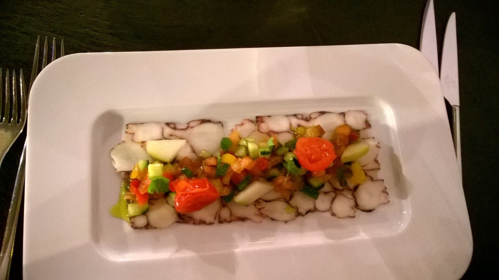 Para começar um polvo, super fininhos e temperado, com pedaços de maçã para realçar o sabor. No prato dele, um leitão com molho do chef, e aquelas ervinhas, que dão um sabor ácido e diferente ao prato, muito bom.
