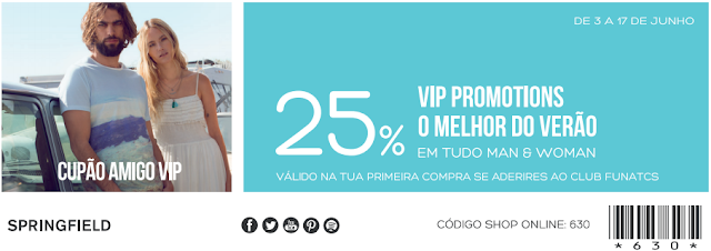 De 3 a 17 de Junho, em toda a colecção disponível nas lojas Springfield ou loja online, poderás usufruir de um desconto de 25% na apresentação deste cupão ou introduzindo o código 630 na tua compra online.